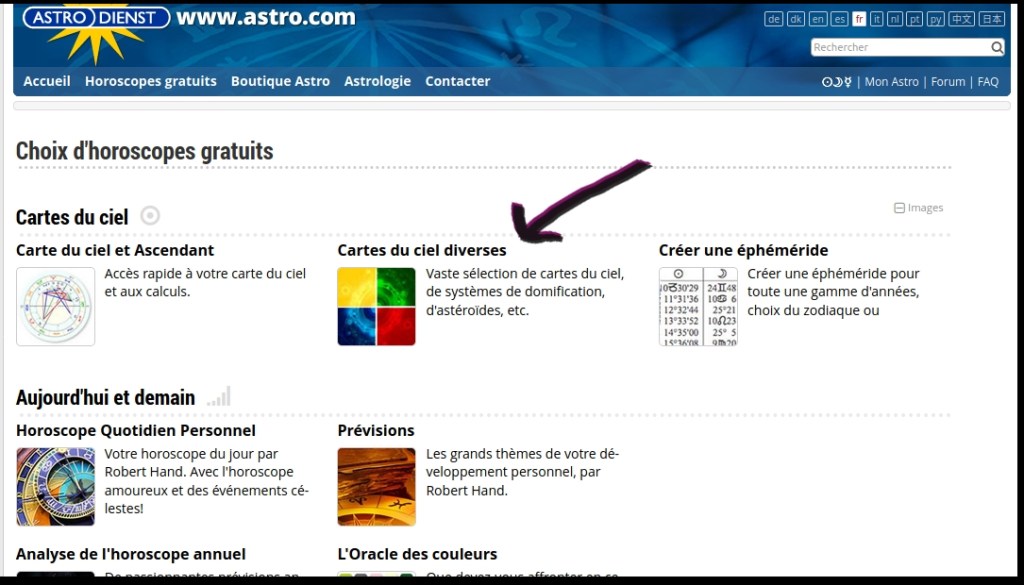 Une fois votre compte fait, et vos données de naissances enregistrées, vous pouvez sélectionner les données de naissances pour les utiliser dans une carte. Vous accéderez alors normalement à l’écran ci-dessous, et vous allez cliquer sur « Cartes du Ciel diverses ».