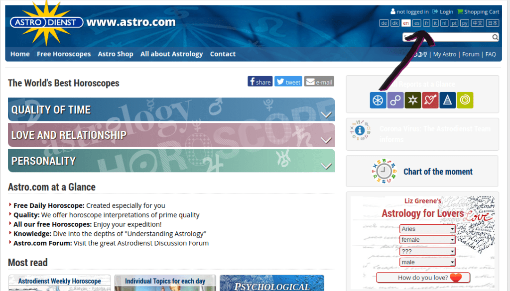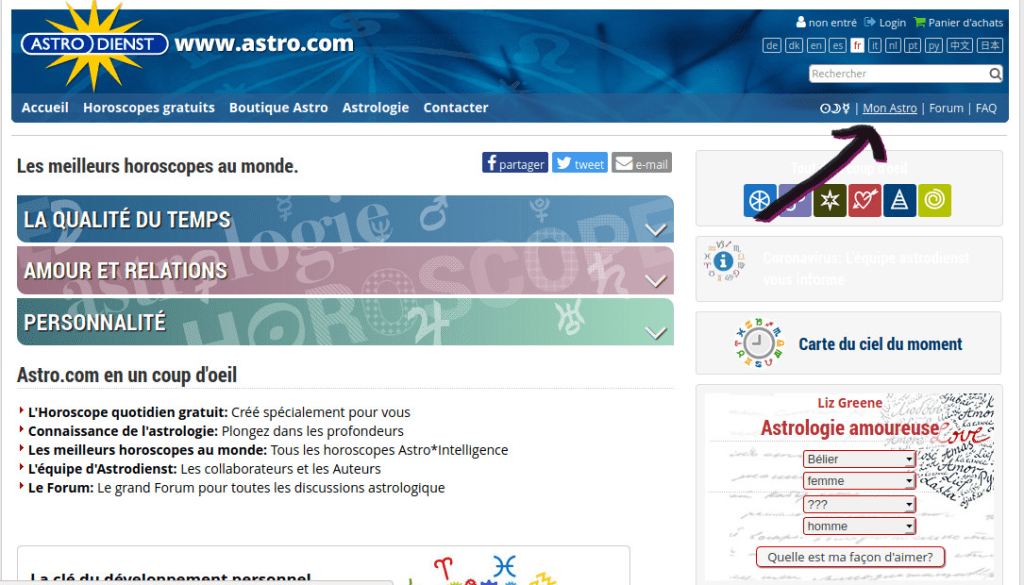 Vous allez maintenant cliquer sur la rubrique « Mon Astro » en haut à droite, juste en dessous des boutons de langue et de la barre de recherche (cf image ci-dessous).