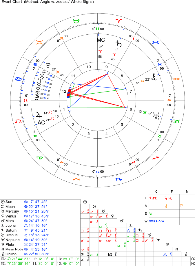 On observe une rare accumulation de planètes en Cancer en maison 12 : la Lune, le Soleil, Mercure, Vénus, Mars, Neptune, ainsi que le Nœud Nord. La maison 12 représente, entre autres, les afflictions et les pertes. Jupiter est proche du degré de l’Ascendant et régit la maison 8 de la mort. L’Ascendant est en Lion, régi par le Soleil en maison 12. Le stellium Cancer est en opposition à Uranus, planète des changements soudains, dans la maison 6 qui représente entre autres les maladies et les blessures. Pluton, planète de la destruction et de la magnification, est proche du stellium en Cancer. Enfin, Saturne en Bélier (signe de sa chute) décime Cancer par un carré. Un thème spectaculaire pour un évènement spectaculaire.