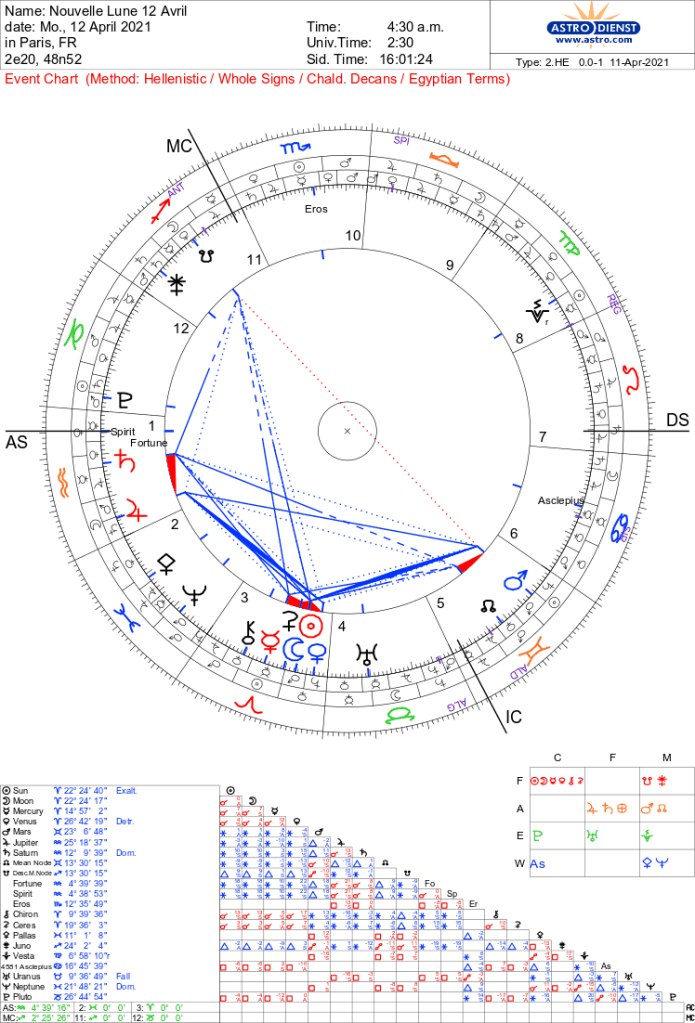 Cette lunaison a lieu en conjonction à Vénus et à Mercure, ce qui est important pour ce qui se joue en termes de projets et d’initiatives. Cependant, Vénus et Mercure n’émergeront pas de sous les rayons avant plusieurs semaines. Mercure fait son lever héliaque le 2 mai, et Vénus le 22 mai. Donc concrètement, il est possible que les résultats de ce que l’on lance pour cette lunaison se fassent discrets d’ici-là : sous les rayons, les planètes indiquent des choses peu visibles, cachées. Mercure émerge de sous les rayons en tant qu’étoile du soir. Vénus sera dans son chariot en Taureau dès le 14 avril, donc même si elle n’émerge que le 22 mai en Gémeaux, il est probable que cette dimension cachée soit moins présente pour les thèmes vénusiens !