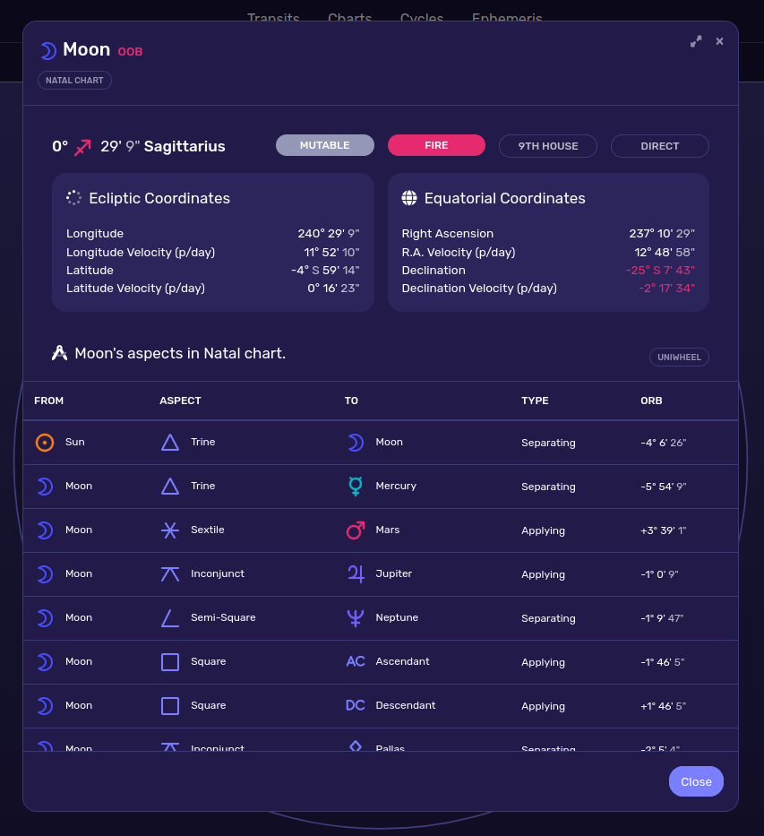 Dans le cas de Hozier, on voit immédiatement avec l’acronyme « OOB » et le surlignage en rouge de la déclinaison que la Lune est out of bounds, hors limites, c’est-à-dire qu’elle s’est aventurée au-delà de l’écliptique. C’est cool que ces informations soient disponibles si facilement dans l’interface de LUNA, car même si ma pratique ne se centre pas autour des enjeux de déclinaison, je trouve très intéressant de les prendre en compte ; dans le cas de la Lune, j’avais notamment apprécié de l’article (en anglais) de Steven Forrest à ce sujet.