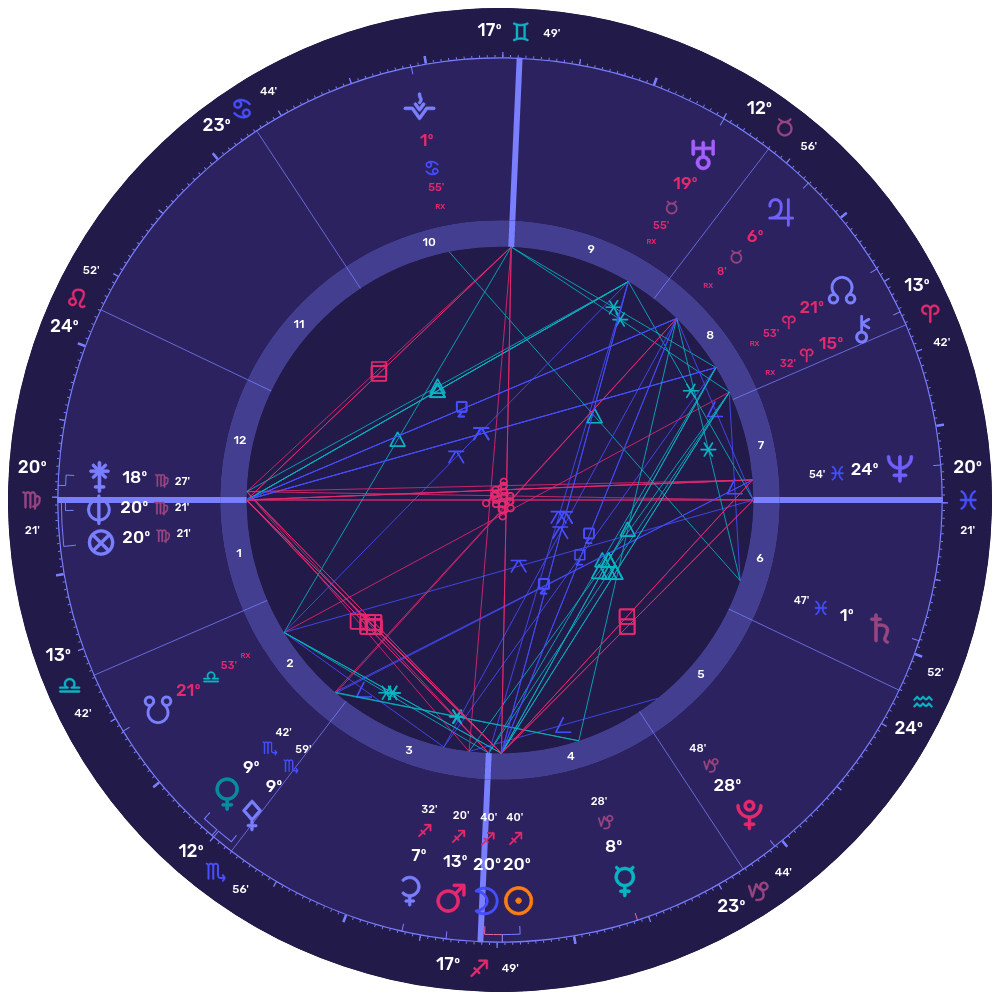 Vénus est aussi en conjonction partile à Pallas Athéna à 9° Scorpion, à l’orée du deuxième décan. J’ai souvent vu Pallas Athéna s’illustrer chez des individus comme une capacité à la défiance des normes mais aussi à l’assimilation pour mieux survivre. Ainsi, on peut parfois noter une dimension très queer à l’expression de cet astéroïde, mais pas seulement. Si l’on observe les mythes qui entourent Pallas Athéna, une diversité de thématiques se dégagent : l’artisanat, la sagesse, la débrouillardise, la revendication, la protection des héros, l’androgynie mais aussi la misogynie internalisée, des difficultés autour des thèmes de la maternité et de la féminité et autres sujets vénusiens, la culpabilisation des victimes d’oppression, entre autres. Parmi les exemples que j’ai trouvés de Vénus en conjonction à Pallas Athéna, j’ai noté Kenneth Branagh, comédien irlandais, né avec Vénus en Verseau conjointe à Pallas Athéna, en maison 8 qui gouverne la maison 11 de l’audience et des groupes, ainsi que la maison 4 des racines, de la vie privée, de la famille et du pays natal. À l’école, Branagh se force à parler avec un accent « RP » (Received Pronunciation), l’accent anglais classique et bien vu, pour éviter de se faire harceler pour son accent natal, irlandais. Je vois ici la capacité d’adaptation caractéristique de Vénus en Verseau I, mais aussi de Pallas Athéna, qui sait adopter des codes différents de ceux généralement acceptés pour sa catégorie sociale. On peut donc se demander quelles capacités spécifiques Vénus en Scorpion en conjonction à Pallas Athéna peut conférer au moment de cette lunaison.