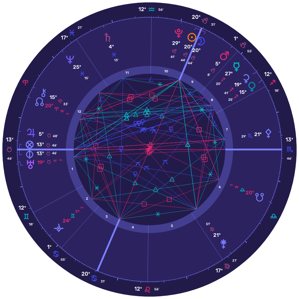 Cette Nouvelle Lune a lieu à 20°44’ Capricorne, dans un signe gouverné par Saturne, et dans le décan qu’Austin Coppock appelle « Le Trône », dirigé par le Soleil et Mercure. La Lune dépend donc ici de Saturne en Poissons, qui est en motion directe et en sextile par signe, un aspect favorable, soutenant. Cette lunaison a lieu en conjonction appliquante à Pluton à 29° Capricorne, lui conférant un ton plus sombre, et d’autant plus majestueux ou peut-être autoritaire. Capricorne III est un décan associé à la carte de Tarot du 4 de Deniers dans le Rider-Waite-Smith, mais cette configuration m’évoque aussi L’Empereur. La lunaison est en trigone appliquant à l’astéroïde déesse Junon à 21° Vierge. Junon représente notamment les thématiques de la loyauté, et si cela est parfois évoqué dans le cadre du couple, il s’agit d’une considération plus générale.