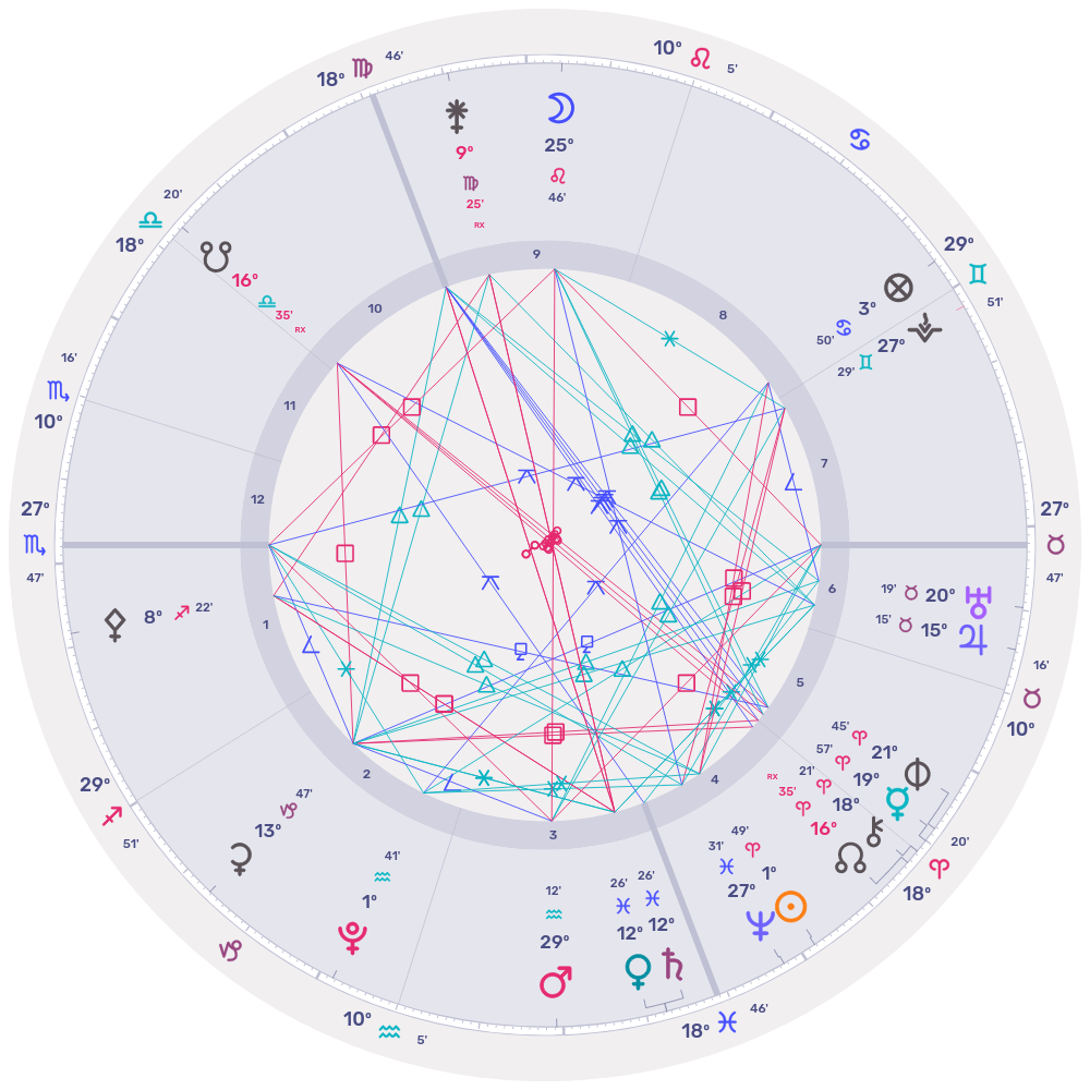 En l’occurrence, la coprésence de Vénus et Neptune en Poissons peut être catégorisée à la fois comme aspect difficile et harmonieux : lorsque deux planètes sont dans le même signe, leurs significations et thématiques se mêlent pour le meilleur et pour le pire. On peut penser à la manière dont la rêverie et l’imagination peuvent être salvatrices et profondément aidantes, mais aussi provoquer de la confusion, de l’oubli, une forme de désorientation. L’union de Vénus et Neptune peut être formidable d’un point de vue artistique, beaucoup moins s’il s’agit d’y voir plus clair, de poser des limites, de situer où l’on se trouve et ce dont on a besoin.