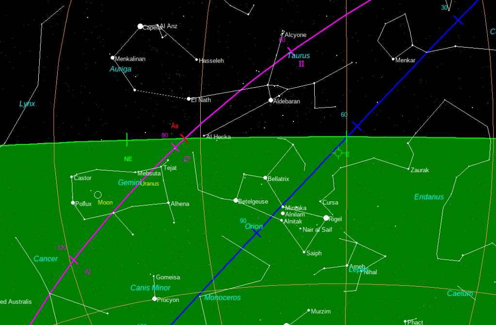 On peut voir Al Hecka, l’une des pointes du Taureau, très proche de la ligne d’horizon. L’arc d’Orion s’apprête à émerger. Sur l’image, on voit aussi nettement la Lune dans la constellation des Gémeaux, entre Castor et Pollux.