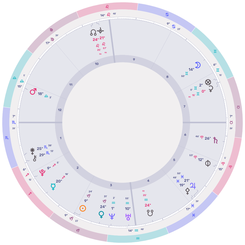 Pour reprendre l’exemple de Hunter Schafer plus haut, on voit que sa maison 1 inclut la majorité du signe du Scorpion à partir de 7°, ainsi que quelques degrés du Sagittaire, jusqu’à 6°.