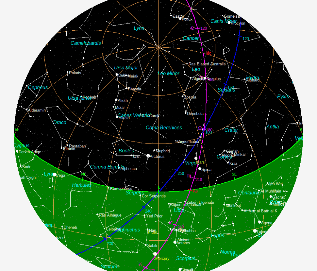 On peut voir l’intersection de l’horizon en vert et de l’écliptique en rose magenta, marquée par « As » en rouge : c’est l’Ascendant ! Un peu au-dessus, on distingue le glyphe Scorpion près de l’écliptique. On voit donc que Schafer est née sous un Ascendant Scorpion dans le zodiaque tropical.