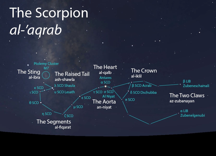 Le Scorpion est une grande constellation, très ancienne. Dans la mythologie babylonienne, c’est un symbole de fertilité, associé à la déesse Išḫara. On trouve des représentations d’un scorpion sous un lit nuptial, et accompagnant des accouchements : la créature semble présider à tout le processus de fertilité humaine. Plus tard, ce Scorpion est placé dans un contexte grec comme vindicatif, cherchant à abattre un guerrier qui aurait offensé Artémis. Cette dernière étant une divinité Lunaire associée aux accouchements, on retrouve des thématiques communes. Manilius, poète-astrologue du 1er siècle de l’ère commune, décrit le Scorpion comme un animal guerroyant, toujours prêt aux hostilités, et s’entraînant au combat même en temps de paix.