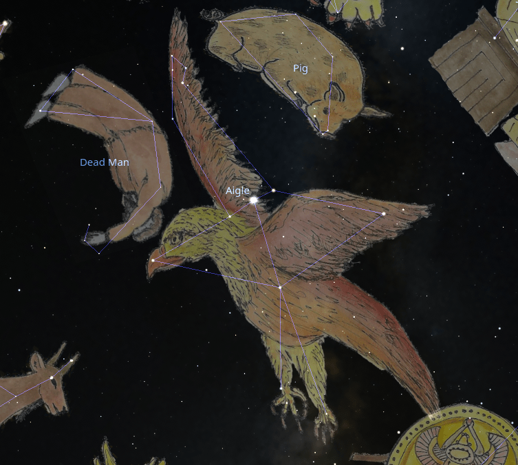 La constellation de l’Aigle est ancienne ; on en trouve trace dans la cosmologie babylonienne. Les constellations environnantes ont pu changer de nom (L’Homme Mort est devenu un Dauphin, par exemple), mais l’Aigle est resté un aigle.