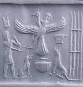 Le motif de l’aigle est aussi vu dans des représentations anciennes du mythe d’Etana, un roi de la cité de Kiš. Le roi Etana voulait un fils et pétitionnait diligemment le dieu Šamaš de lui accorder descendance. Šamaš lui donna l’instruction d’aller dans les montagnes trouver un aigle emprisonné, qu’il nourrit pendant sept mois afin que l’oiseau reprenne des forces. Enfin, l’oiseau lui offrit de l’emmener haut dans les cieux pour une audience avec Ištar, la maîtresse des naissances. L’histoire est malheureusement fragmentaire et on ne dispose pas d’une conclusion claire, mais on peut présumer qu’Etana obtint une réponse positive à sa requête, car on sait qu’il a eu un descendant qui lui succéda sur le trône.